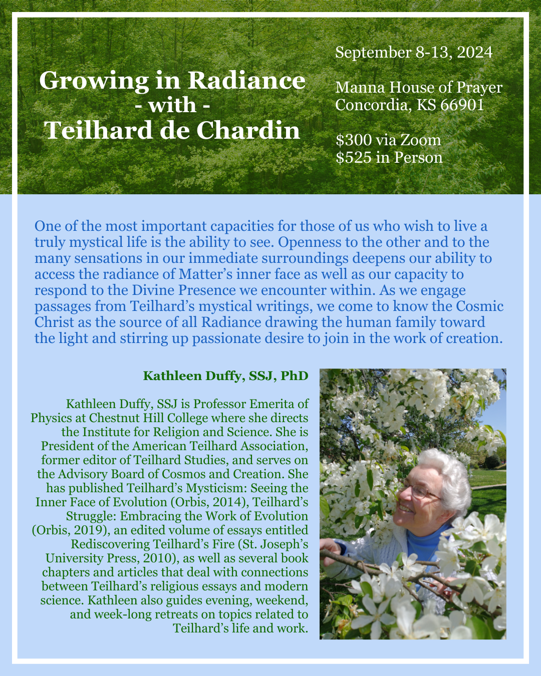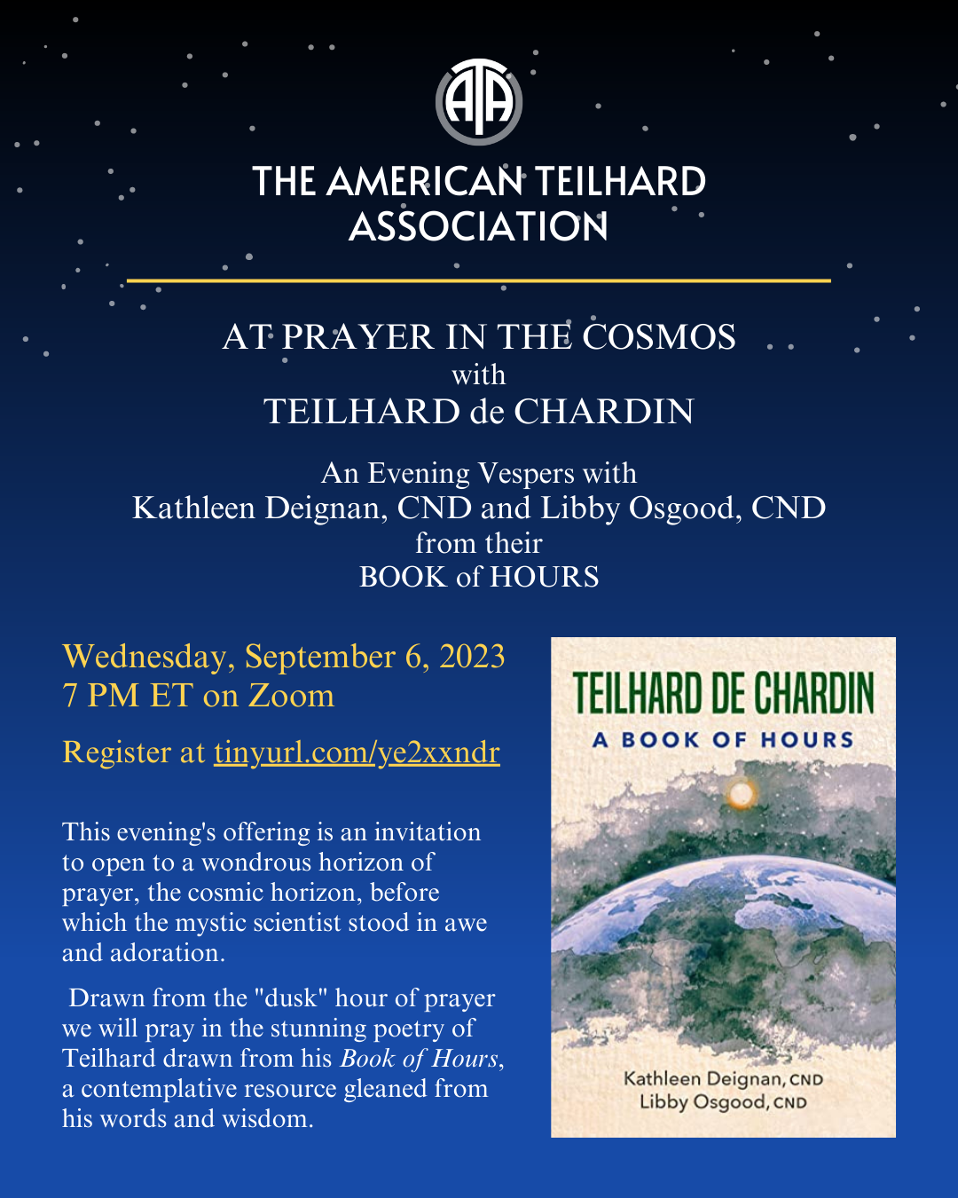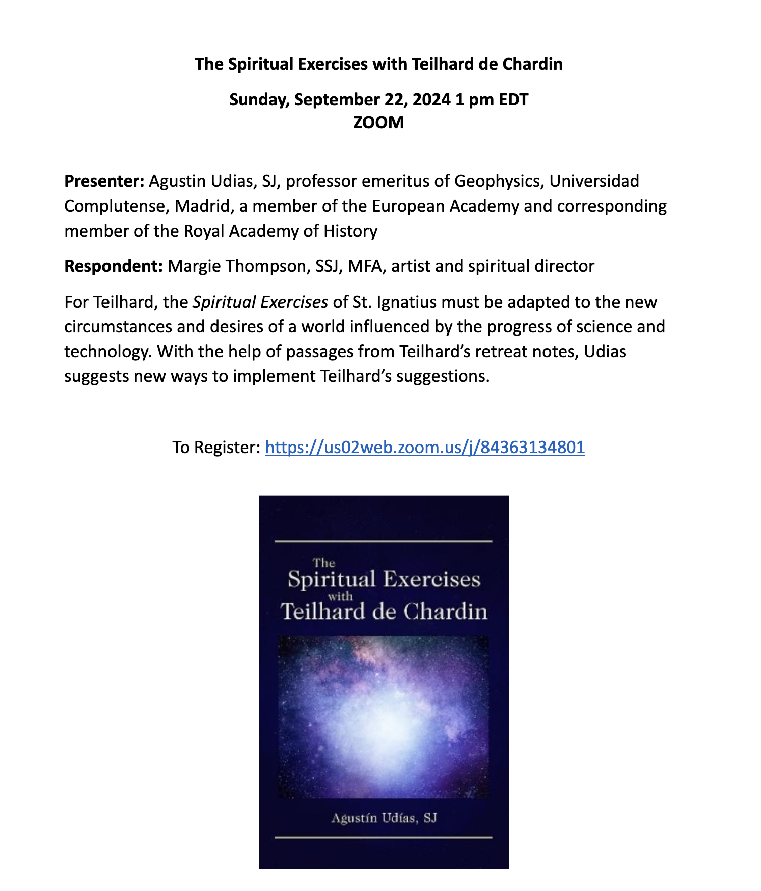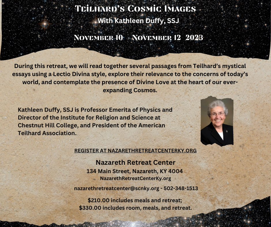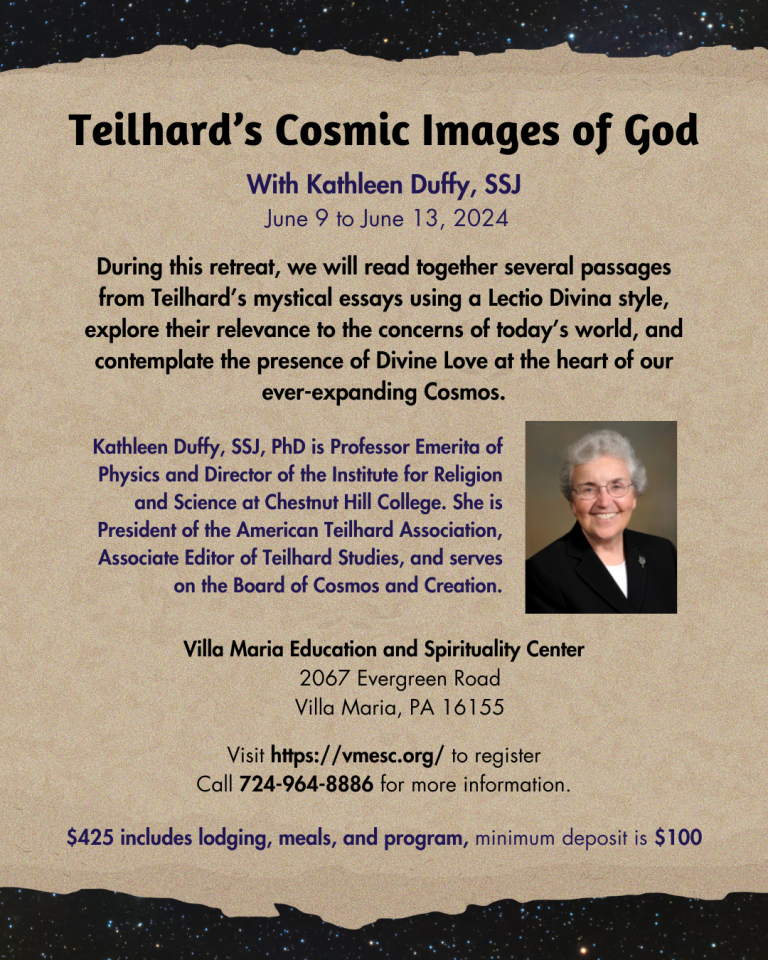 Pierre Teilhard de Chardin: The Mass on the World: The 100-year Anniversary, edited by Kathleen Duffy, SSJ, is a collection of lectures delivered at a week-long celebration in NY in 2023 to commemorate the 100th anniversary of Pierre Teilhard de Chardin’s writing, The Mass on the World. Teilhard-Monde and the American Teilhard Association hosted members of Teilhard’s family and speakers from around the world (France, USA, Argentina, India, and more!) to reflect on Teilhard’s vision for the world. The book is available for purchase on Amazon here. View the book flyer here.